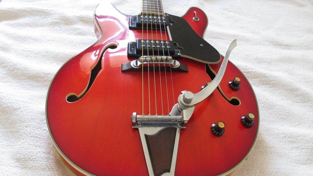 Epiphone modelo 5102 TE guitarra eléctrica “Semi-Hollow” de 70’s, hecho en Japón. Esta belleza se encuentra en excelentes condiciones, con algunos cortes, rasguños, marcas de la correa, y algunos golpes, todo original.
